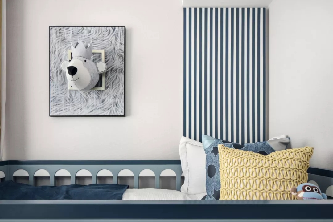 男童房间则是以森林冒险为主题展开的设计,白灰蓝主调,即使儿童房也摒弃传统认知的鲜艳色彩,以童趣设计感物品装饰,整个格调提升,避免幼儿成长过程中装修过时,小主人也在潜移默化中得到了美商的提高。人是在环境中激发对美的认知的,在高级感的空间里更有利于对孩子的培养。